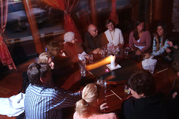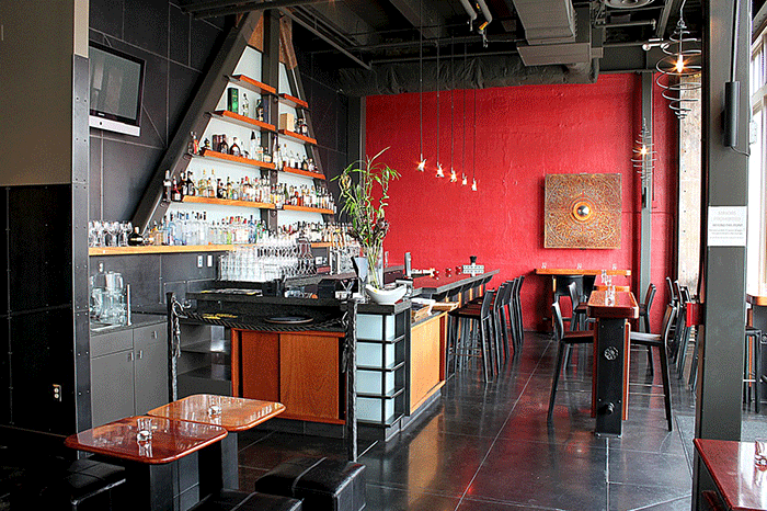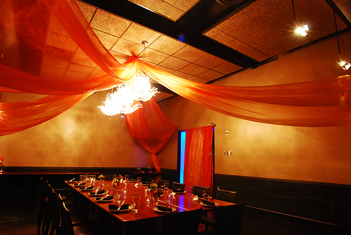 Our bar, featuring artistic iron works, color-shifting bar wall, and ornate lighting is the perfect place to relax and enjoy drinks and food with friends.