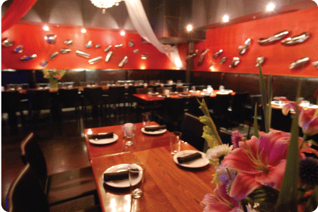 For larger parties, our Banquet Room seats up to 55. It can accommodate even more if not all are seated. This private room is adorned with Victorian chandeliers, sculptured metal artwork, and a large archway entry steel door with lighted glass columns. This is truly a unique and stunning place to hold a large company meeting or wedding reception.