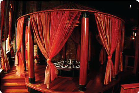 For small parties, 12-14 maximum, such as a birthday or anniversary celebration. You will sit Thai style in a round pavilion surrounded by ornate drapes and sheers and lit by a famous theatre lamp.
