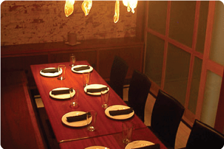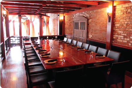For private, small parties, 12 -14 maximum. You’ll enjoy a lush environment of Japanese style panels, cherry rafters, and a long table lit by an exquisite French lamp.